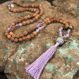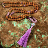 Specifications: 108 rudraksha seed beads (7mm), tassel, Intention Bead guru bead, sterling silver OM charm, supporting gemstones: Light Lavender Amethyst, Garnet, Green Jasper