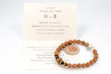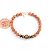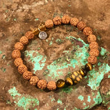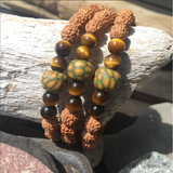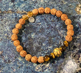 Materials: Stretch elastic, rudraksha seed beads, sculpted clay Intention Bead, sterling silver OM charm, supporting gemstones: Tigers eye & Citrine