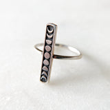 This sterling silver ring features a rectangle bar with nine brightly-finished moons, shown in waxing, full and waning phases. Set in an oxidized channel to enhance the detail, the moon's progress towards the center of the bar. This ring would look great on its own or topping a stack of rings.
