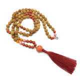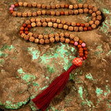 Materials: 108 rudraksha seed beads (7mm), tassel, Intention Bead guru bead, sterling silver OM charm, supporting gemstones: Red Jasper, Amber, & Rhodonite